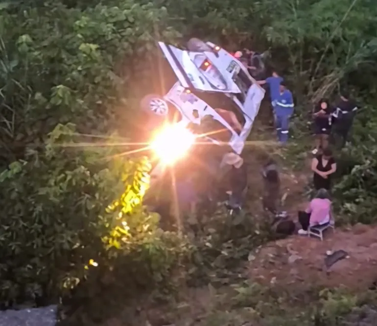 Na tentativa de evitar o impacto, a van derrapou e acabou saindo da pista, caindo na ribanceira.